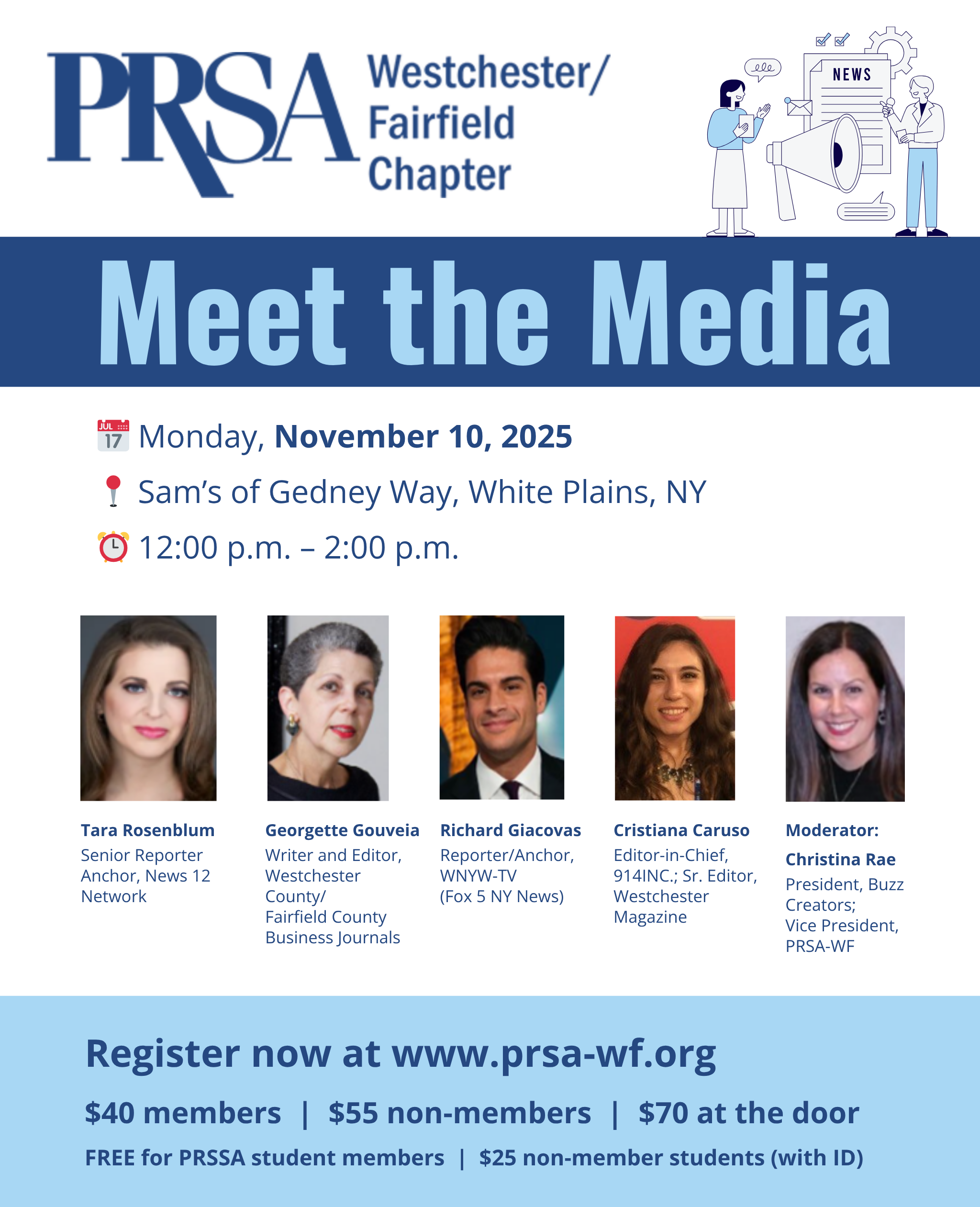 Registration in advance is required. PRSSA students and non-PRSSA students register by emailing us at admin@prsa-wf.org.